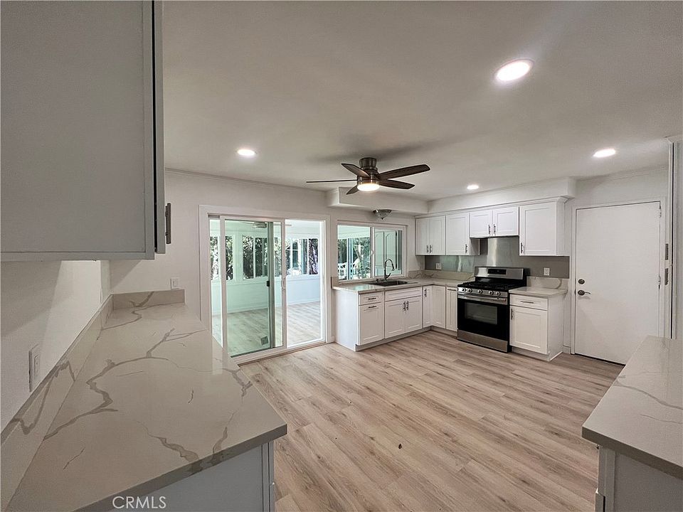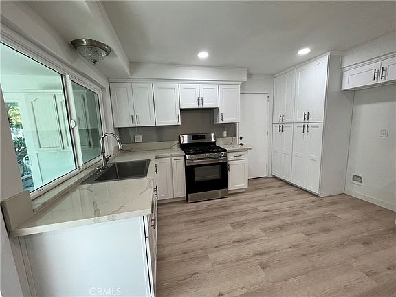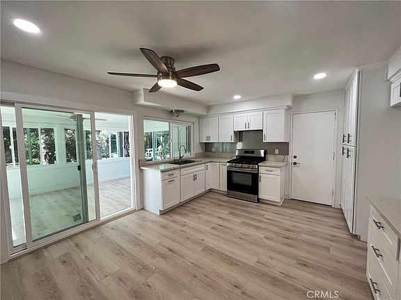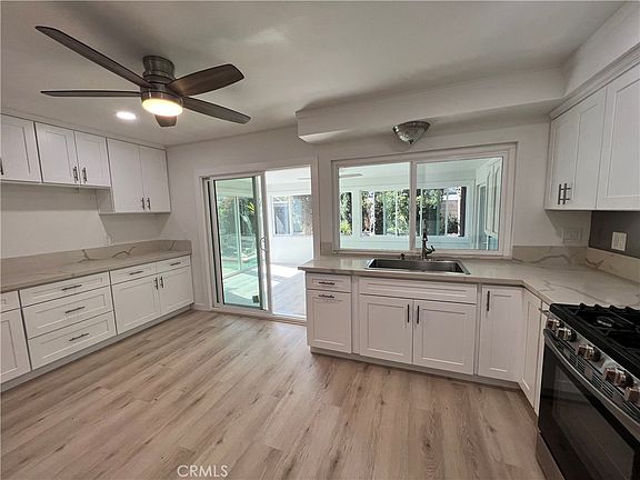 Remodeled 4 bedroom/2 bath contemporary home with a permitted sunroom and upper deck , a shiny gem in a desirable neighborhood in the heart of Orange. Two bedrooms are located downstairs, including master. There is new waterproof laminate flooring throughout, recessed lighting and fans in all bedrooms. Updated kitchen has nice features including white shaker cabinets with quartz countertops, double pantry, stainless steel micro and range, glass trimmed upper cabinets, convenient pull out base drawer inserts and a touchless kitchen faucet. Home has wonderful exterior features including mature trees, automated sprinklers in front and back, and attached 2 car garage.