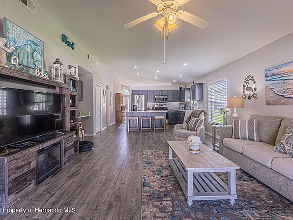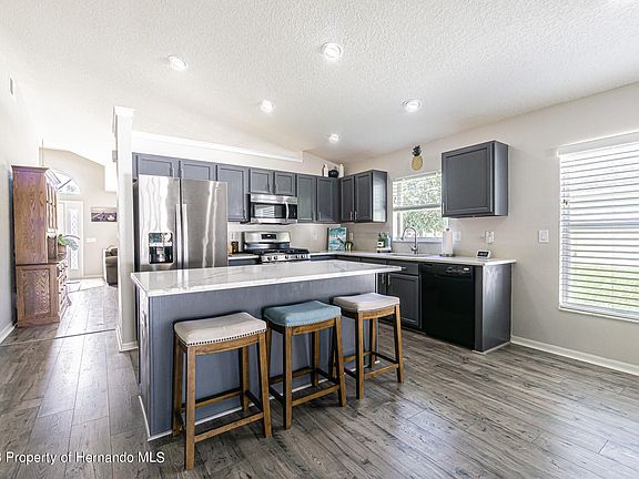 Beautiful Hernando Oaks home with 4 bedrooms, 2 bathrooms and a great layout with split bedrooms and 1991 sf of living space. Lots of upgrades, including new counter tops, new flooring and paint through out. Upon entering the home, the formal living/dining room combo greets you and is the perfect place for a large dining room set. The home also has an open island kitchen/dinette/family room area that is perfect for entertaining, with new vinyl flooring that flows from this area throughout the home. The vaulted ceilings give an extra openness feel that flows from one room to another. The large master suite is located to the rear of the home for added privacy which features a spacious walk in closet. The master bathroom features tile floors, dual vanities, walled shower stall, and a wonderful corner garden tub, perfect for relaxing! A private hallway off the kitchen leads to three bedrooms with new vinyl flooring and a bathroom with new tile flooring and walk in shower. Hernando Oaks is a golf cart friendly community with a beautifully designed 18 hole course and its own restaurant. Guard gated community for extra security. Conveniently located with easy access to expressway or I-75 to head south toward Tampa or north. No CDD fee! Schedule a tour of your new home today!