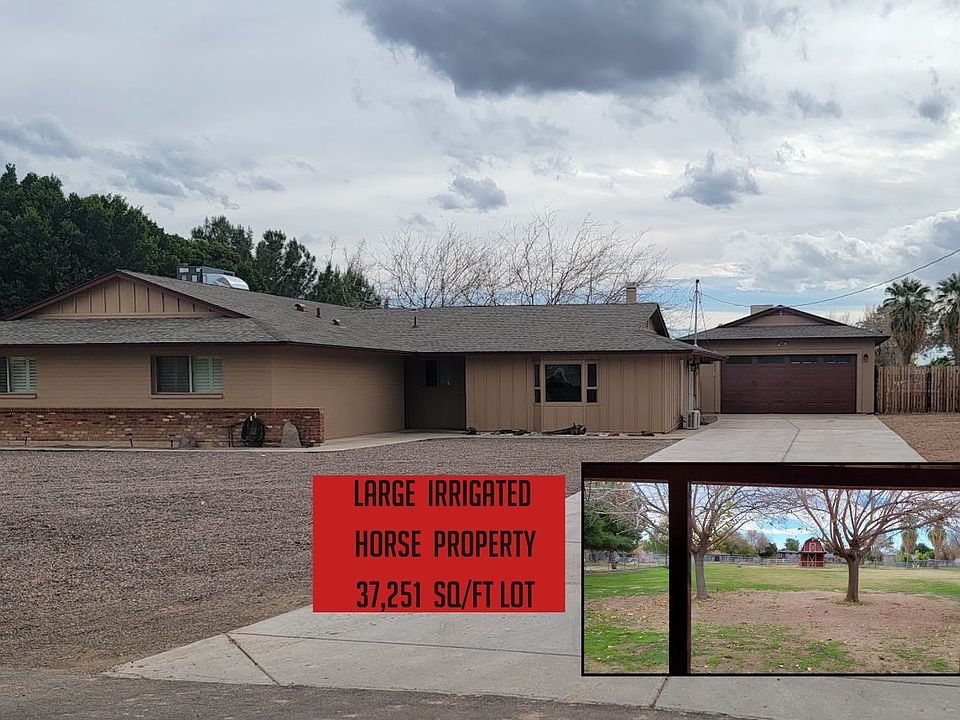 This is an amazing ranch style property on almost 1 acre lot. Home has been updated with porcelain plank style flooring through the whole home IN 2024. Updated kitchen that is open to a big eat-in kitchen. Large family room and Living room. A/C replaced 2022. Covered back patio that is almost the length of the back of the home. 23x39 detached garage with 10' ceiling and front and rear garage doors. Wonderful irrigated back yard with grass and mature trees. There is a horse corral with small barn. The rent includes the irrigation that is done every 2 weeks and the landscaping maintenance of back yard done every 2 weeks. RV gate and parking on West side of garage. A lot of space for your Boats/Toy hauler storage. Owner is a Licensed AZ Real Estate agent. The rent includes the water irrigation every 2 weeks. The landscaping done every 2 weeks. This is a horse property and has some accommodations for large animals. The home water, trash, electric , & required Renters policy is the responsibility of the tenant. The Tenant shall keep the property and home in very good condition and clean. There is to be no smoking inside the home.