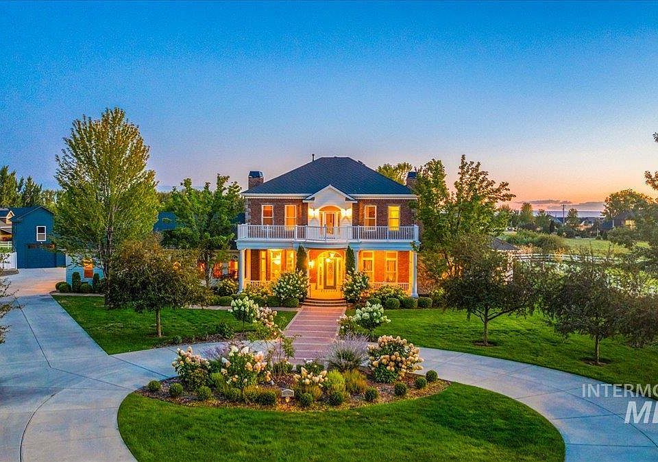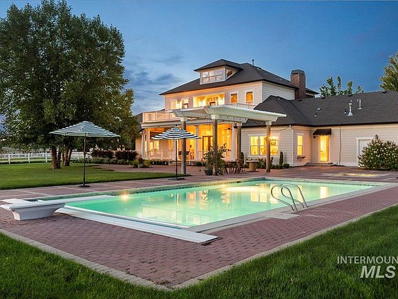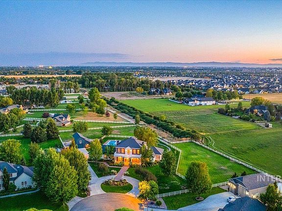 Welcome to your Eagle Estate Dream Property! Over 4840 sqft of custom woodwork, high ceilings, 4 fireplaces and natural light. Nestled in a quiet cul-de-sac, enjoy 2.27 perfectly planned acres of lush landscape, beautiful lawns and separate irrigated pasture. Enter from the impressive driveway to the covered front porch and into the grand foyer with marble floors. Main level boasts master suite with heated floors in bathroom, hardwood, private views of your backyard, office, formal dining, and plentiful living space. 2 decks from 2nd floor with another master bedroom, bonus room and 2 additional bedrooms. Spiral staircase leads up to a fun 3rd level loft! Step outside to a huge covered porch to enjoy your pool, spa, fire pit and yard games. Mature trees offer shade and the acreage offer fantastic views. Driveway leads to attached 3 car garage and 2 stall barn with loft and shop for animals and boat/trailer parking. This home was built with premium quality and purpose from top to bottom, & Fresh Exterior Paint