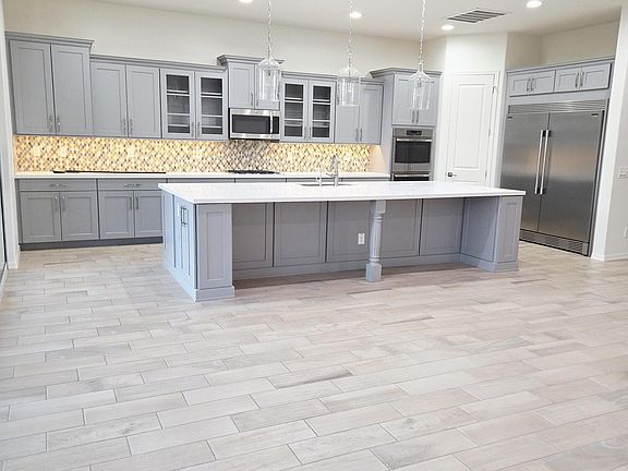 This stunning 3-bedroom, 3-bathroom home with a separate office is a true gem. The gourmet kitchen is a chef's dream, featuring an oversized quartz island, a spacious walk-in pantry, double refrigerators, double freezers, a double oven, a gas cooktop, and new dishwasher. The kitchen seamlessly flows into the open-concept living and dining areas, which offers a wall of glass that opens up to a sparkling pool and low-maintenance synthetic grass. A covered patio off the dining area is perfect for outdoor living, and a convenient doggy door in the sliding glass door is ideal for your furry friends.