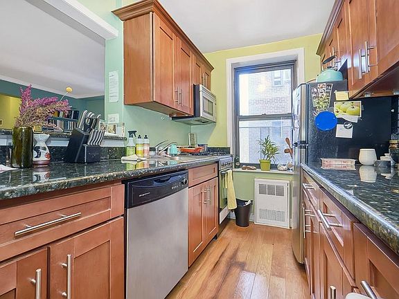 This Unique residence a resident super, several porters, parking, bike room, storage room and laundry facility. Pets are welcome too! Just steps away from the A train and three blocks away from the 1 train. You're close to shopping, restaurant, Fort Tryon park, the Cloisters and much more! The open plan kitchen with breakfast/dining bar features granite counter tops, stainless dishwasher, refrigerator, microwave and range, abundant cabinet space and ceramic tile floor. The pedestal sink & sliding glass shower with full tub make the bathroom inviting. New hardwood floors, large closets with organizers, and crown molding highlight this comfortable home. Sun-Flooded throughout the day. Built in Bookshelves! Excellent Closet Space with plenty of room for extra storage.