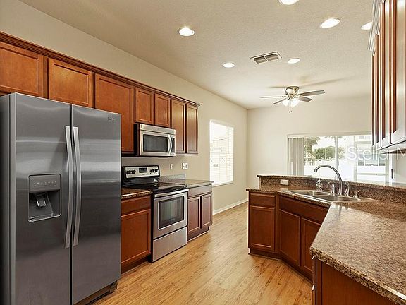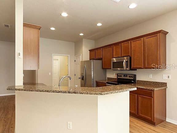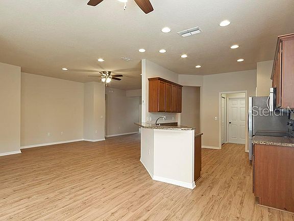 Like - new Florida style open floor plan home with many new upgrade features. Every square foot of flooring has been replaced and upgraded.. All new upgraded materials: "Duralux" waterproof Laminate used in most common areas. Quality carpet and pad used in "3" bedrooms . Natural Travertine Stone tile on Lanai. New ceiling fans with lights have been .added to all living spaces. Ceiling fan added to newly screened Patio Ultimate privacy added by enclosing the entire yard with an upscale PVC fence with a five foot gate for access and service. Assurance of a continued beautiful lawn with a completely upgraded and serviced irrigation system. New cordless Venetian Faux Wood Blinds at all windows and verticals at sliding door. Convenient laundry tub in garage. Beautiful Slate entry will appeal to every visitor. Convenient kitchen layout features an abundance of all wood cabinets.