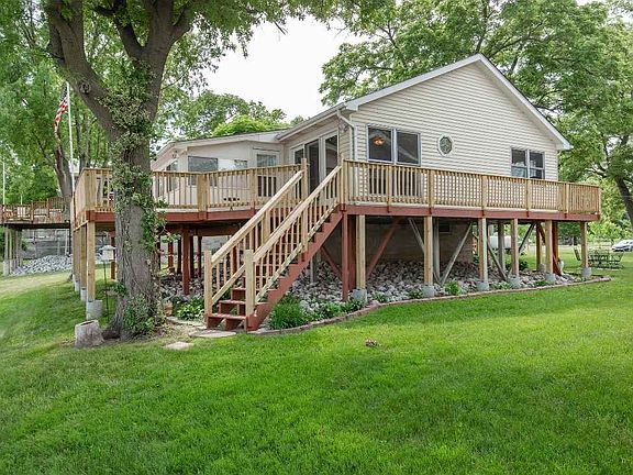 Enjoy the beauty and fun of river living in this well maintained cabin on Enchanted Island. The three seasons room is lined with windows to give you a picturesque view of the main channel of the Mississippi river. Sit on the wrap around deck and watch the wild life and boats go by. The home is very well maintained with a newer roof, windows and furnace. This home is beautiful year round too. The master bedroom is large and has two closets, the kitchen has been nicely updated and includes stainless steel appliances, there are beautiful french doors with a river view in the dining room, and between the living room, family room, and 3 seasons room there is plenty of room to sit back, relax, and enjoy your cabin. Most furniture is negotiable. Lot is owned by the HOA.