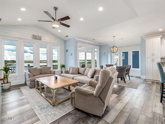 LOCATION & UPGRADES GALORE! Welcome to this stunning island property situated at one of the best locations on the entire island. This home is located on a peaceful side street with very few houses, just off the main road, with a beach access just a short walk across Island Drive in the HIGHLY SOUGHT AFTER & COVETED PHASE 5 area of North Topsail Beach. This home has been meticulously maintained by one owner & has never been rented. There are incredible sound & ocean water views from every level. It gets even better because this lot has very affordable AE flood insurance available & is even connected to sewer. This custom-built home is full of upgrades, including: an elevator, all Viwinco windows & sliders, shiplap accents throughout, all tiled showers, marble countertops in the bathrooms, luxury trim & molding throughout, WPC waterproof/scratch resistant flooring throughout, & vinyl railings on decks. The large kitchen is located on the top floor with breathtaking water views & encompasses stainless steel appliances, marble countertops, tile accents, gorgeous white cabinetry, a big stainless steel farmhouse sink, & a microwave drawer in the center island. The exterior of the home has hard board siding, architectural shingles, fenced-in backyard, firepit, beautiful landscaping, outdoor shower, outdoor storage room, and there's also an active CAMA permit already in place to install a pool if you choose. This coastal property has 4 bedrooms, 1 flex room, and 3.5 bathrooms in total, boasting over 2,400 heated sq. ft.! There are 2 full bathrooms & 3 bedrooms located on the second floor. There is 1 bedroom, 1 full bathroom, 1 half bathroom, & the main living area located on the third floor. There is also an extra room, upon entering the residence, located on the first floor, that can be used as an additional bedroom, office, storage, or flex space. There are tons of open space located under the home to park your boat, trailer, & vehicles. This home is spectacular!