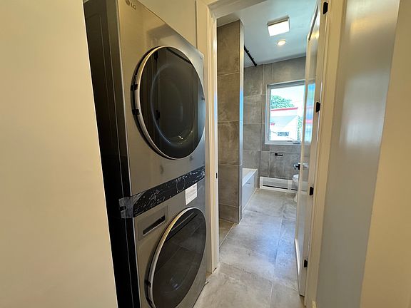 High ceilingsRecessed lightingStone bathroomCustomized wardrobe closetStacked washer dryerCoat closetAnti-fog vanity mirror