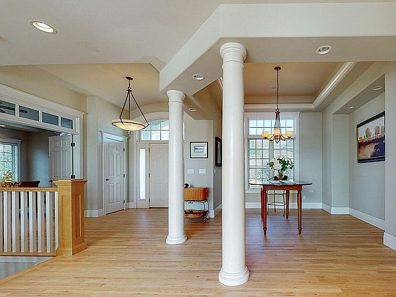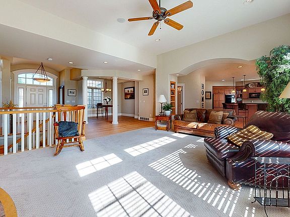 Stunning custom home with soaring ceilings, wide trim, six-panel doors, and walls of windows! Pillars separate the exquisite dining area from the majestic great room with a gas fireplace and a full wall of maple built-ins! Gourmet kitchen with Star On solid surface counters and many maple cabinets. The main floor laundry is being used as an office but could be converted back. Huge pantry off the kitchen. The main floor primary suite features his and her sink with a corner jetted tub and walk-in tiled shower. The walk-out lower level offers a second fireplace, a set bar for entertaining plus 3 bedrooms and 2 full baths! Main floor office and mud room. We love this home! Call or email today for a private showing.