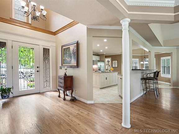 Stunning, rare find on this stately 1/2ac South Tulsa home feat-2 spacious beds on 1st level, formal dining, 2 living areas w/fireplaces, gourmet kitchen w/granite island & dbl ovens, vaulted ceilings, plantation shutters, crown molding, hardwoods & tons of storage thru out. The well appointed upstairs floorplan incl-3 spacious beds (5th option could be gameroom) & offers lrg floored attic space. Walking distance to Jenks SE Elementary. Separate 44X36 sq ft fenced-in dog park/garden area.