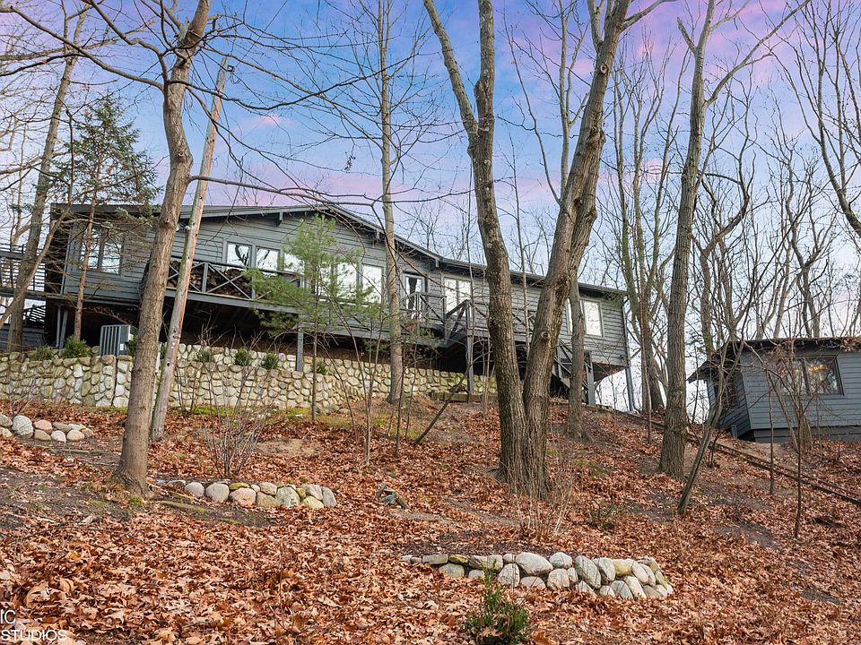 This fully furnished designer retreat is perched atop a wooded dune and steps from your deeded private Lake Michigan beach. This 4 bed/4 full bath home's open floor plan, all season porch, and abundant outdoor space makes it the perfect Michigan getaway. Open the LaCantina sliding pocket doors to the heated screen porch after cooking pizzas for your guests in the Mugnaini wood fired oven and they may never leave! Dining outside on the deck or inside on the 8 foot walnut island, you are in the treetops and it is magical. The bunkhouse also provides a fun spot for hanging out or additional guests. Some of the sophisticated details include: Chef's kitchen with Monogram appliances including induction cooktop, speed oven, concrete countertops, Restoration Hardware lighting, custom Amish-made
