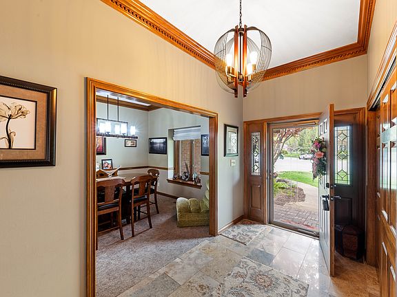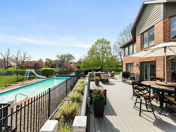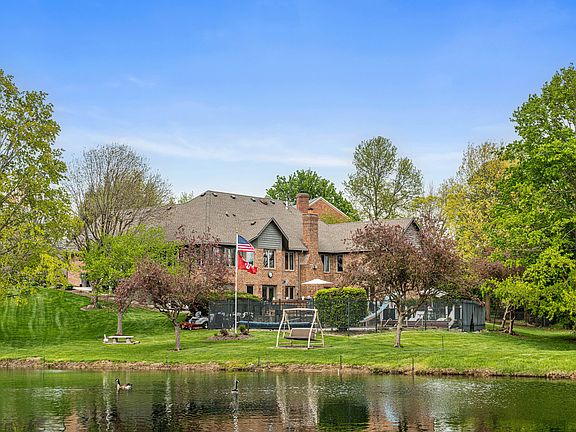One of a kind, awesome cul-de-sac lot on the pond! Super, custom built home, in popular Moss Creek. Great room with vaulted ceiling & fireplace, formal dining room with 10 ft ceiling. Eat in kitchen features granite countertops & accenting backsplashes, stainless steel appliances and 10 ft ceiling leads out a 3 season sun room! Owner's suite features 10 ft trayed ceiling, w/i closet and remodeled bath with walk in multi head shower and separate free-standing tub.W/O basement with rec room has wet bar, fireplace daylight windows and door out to the large with BG pool and hot tub! 4th bedroom is used as an office has beautiful built in shelves. 2 bonus rooms in basement have been used as bedrooms but do not ingress/egress windows. HVAC 10 yrs