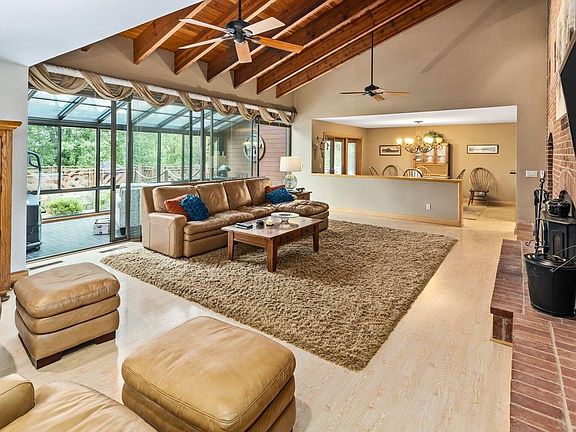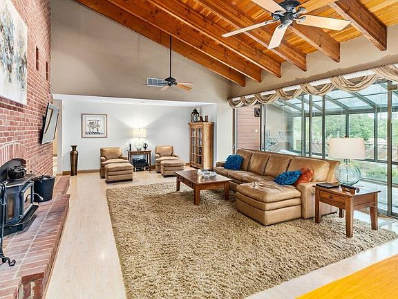 Custom built 2156sqft (per auditor). Contemporary Berm home on private .765 acre lot. 2x6 exterior walls California Redwood & Stone exterior. Vaulted ceilings in spacious great room opens to solarium. Pella windows 2+ car oversized garage w/9'x8' doors. Remodeled kitchen with counter bar. Spacious pergola opens to 2-tiered deck.