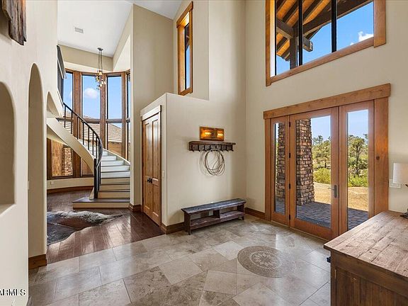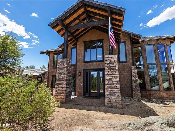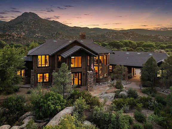 Beautifully remodeled, private estate set upon 1.71 acres with gorgeous views of National Forest & Granite Mountain. 4,176 sq ft Ranch Estate boasts 3 bed, 4 bath plus 3 offices/flex spaces, chiefs kitchen w/ granite counters, walnut cabinets, generous island & eat-in dining, sprawling main living room w/ formal dining. Sprawling, split level floor plan has been perfectly positioned to allow for the amazing views from every vantage point. Fully fenced wrap around rear patio with fireplace, spa, dining & lounge areas to enjoy the natural open space. Upper primary suite offers its own private media area w/ cozy fireplace & hidden speak easy room w/ terrace off the walk-in closet. Home has great pride in ownership & is a must see behind the gates of exclusive American Ranch.