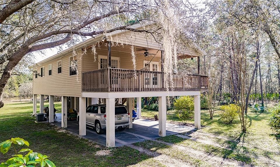 Country living in this private 5.74 acre property where you can see the stars at night. Elevated tree house living in this block and wood constructed home. Scandinavian style and colors with an open floorplan with vaulted ceilings. From the moment you drive up to the long and winding driveway the peaceful quiet of the country will make you slow down and relax. Treed privacy with hundreds of trees and many flowering plants including a peach tree, lime, cherries, mulberry, crepe myrtles, hibiscus, azaleas, gardenias and many more. The 5.74 acres is partially fenced and would be perfect for horses or goats or other farm pets. The lower level is currently used for covered parking and storage and has a laundry room. This is all space that could easily be finished and added to provide more under air square footage if desired. Upstairs the home has a deck that wraps around to the side and is covered. Beach house ambiance in this elevated home with superb views of the property and surrounding land. Three light and bright bedrooms and 2 full bathrooms plus a dining room and living room and kitchen feel very spacious in this home. French doors lead outside to the covered porch which is the spot to hang out with a good book. Room for hobbies, boats, campers, garages, zoned agricultural and no deed restrictions. So many possibilities in this private oasis, only a 20 min drive past Lakewood Ranch Blvd. Ac is 3 years old, well has a water softener, septic, and some newer appliances. Not in flood zone!