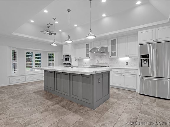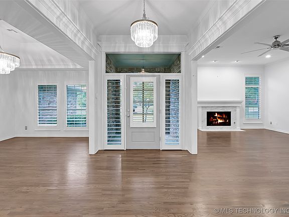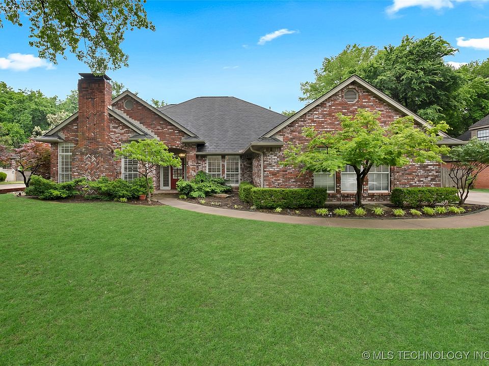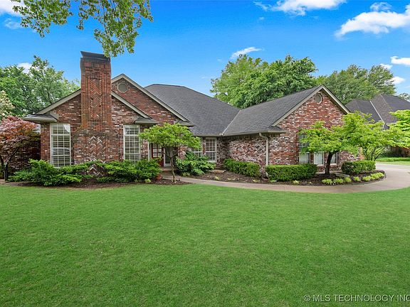 Rare Opportunity to own a one level, fully updated home in Jenks Southeast!!! Sought after split bedroom floor plan! Gorgeous full brick single story nestled on an established HALF ACRE lot in Barrington Place. Lovely selection of color, design & texture throughout plus a re-imagined open kitchen living with great views of pool, pergola & grounds! Updates/New Finishes galore include: Very open light & bright kitchen with upscale appliances, marble counter tops and backsplash, faucets, lighting, hardware! All cabinetry is new. The sink/plumbing was moved to a fabulous & functional island transitioning the kitchen to the great room. Genuine hardwood floor in living areas, dining, hallways & bedrooms; tile in baths, kitchen & utility. Two bathrooms have zero entry walk in showers. Two bathrooms have tubs. Plantatin Shutters in Living areas & Primary Suite. Wonderful flow - perfect for entertaining! Each living area has a fabulous fireplace. All four bedrooms are spacious with great closets. Be sure to check out the floor plan sketch at the end of the photo gallery & note the perfect position of the 3 bedrooms with adjacent baths!!! Abundant ambient light filters through each room! In addition, there is more than adequate storage elsewhere throughout the home. A 3 car Garage is a great amenity and with its side entry, does not deter from the inviting, well manicured front elevation! Close to the finest schools both public & private. Easy turnpike/expressway access. Great shops & eateries are a quick 5-10 minutes/half mile away!