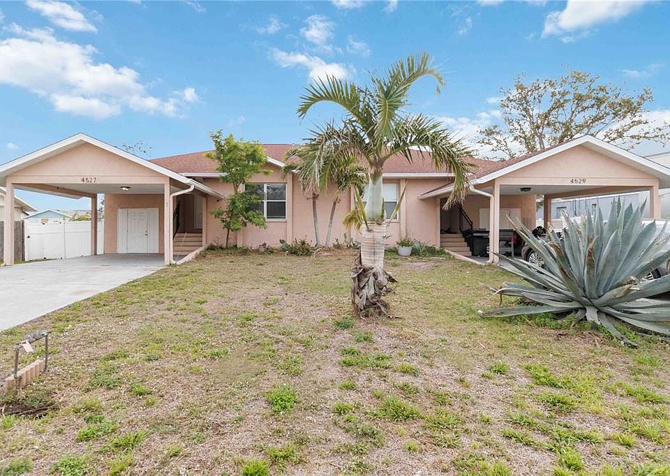 Introducing a money-making monster in West Bradenton! This elevated duplex, built in 1990, features two fully updated units, each with three bedrooms and two baths. Both sides offer interior laundry, luxury vinyl plank flooring thoughout, freshly painted interiors (within 2 years), granite countertops, and updated bathrooms. One unit includes a brand new A/C, both sides have water heaters less than 2 years old, and the 2016 roof ensures insurance peace of mind. Elevated out of the flood plain, each unit has two covered carport spaces with storage units and tons of additional parking, and both exterior A/C units are elevated as well. The living rooms have extremely high vaulted ceilings with skylights, allowing for an abundance of natural light. The backyard is completely privately fenced with vinyl fencing. 1 side of this impressive and rare duplex has been left vacant for the ability of house hacking A.K.A. someone to live in one side with a conforming loan with as low as a 3% down payment and rent the other side out to offset mortgage expenses. The other side is currently rented out at $2300 a month. With no HOA and zero rental restrictions, located in unincorporated Manatee County, long term or short-term rentals are both prime opportunities for any investor. Just minutes from Anna Maria Island, this is an unbeatable investment! (All Pictures are from 4527. 4529 is comparably updated and currently rented)
