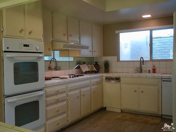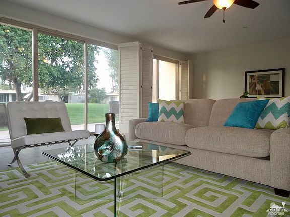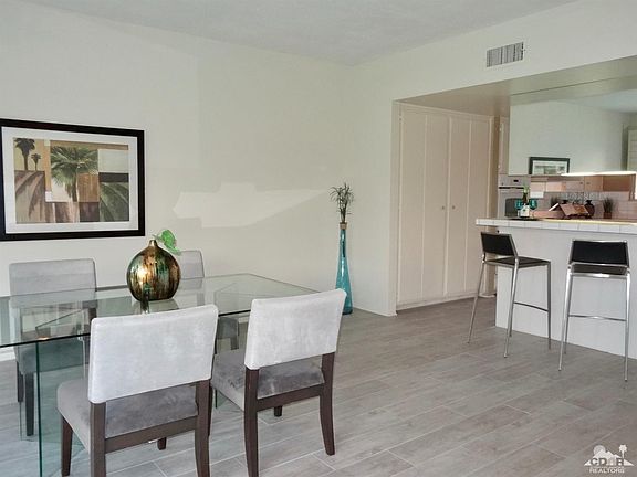 This Mid Century Modern Home with 3 bedrooms, 3 baths, 2153 Sq. Ft. features an open living concept with 9Ft. ceilings, stunning ceramic tile floor flowing from the entry into the kitchen, great room, hallway, guest and master bath. Unit has Insulated double pane windows & sliding glass doors, plantations shutters, ceiling fans, skylights, breakfast/wet bar and gas fireplace. Bedrooms have all new updated mirrored glass wardrobe doors and newer carpet. Roof has been redone and AC unit 5 ton coil replaced. There is an attached golf cart garage and a detached shared single car garage with a storage closet. Amenities in this 26 acres of paradise include 4 par-3 golf holes, 4 small lakes, 6 pools, 3 spas, 2 tennis courts and a beautiful Clubhouse. Lovely green belts mixed with desert landscaping surround the community. Indian Wells offers many perks to homeowners including free use of the Hyatt Resort fitness facility and very reasonable rates on 2 championship golf courses.