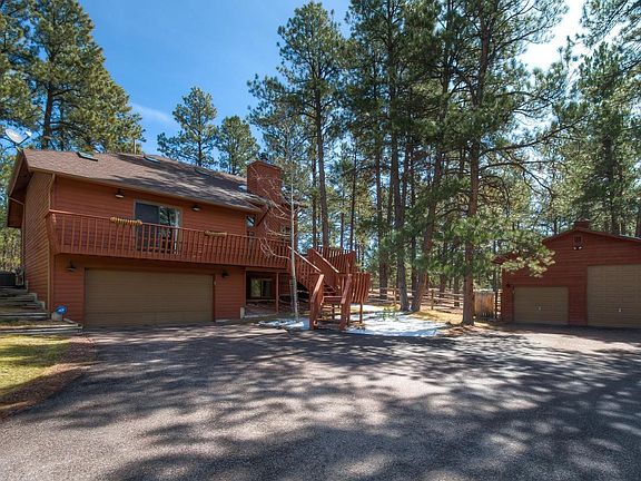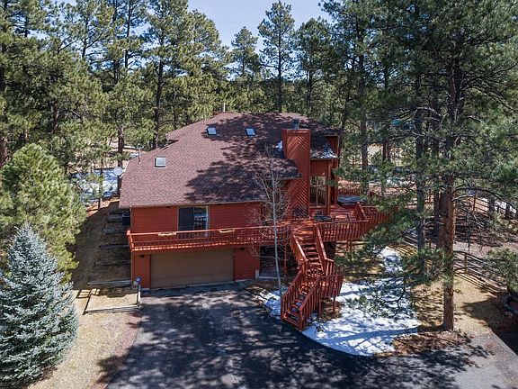 Custom secluded home in lovely Saddlewood community! Pristine oasis nestled in Ponderosa Pines flanked by meadow and open space complete with walking forest trail! Meticulously maintained and upgraded home with new pro stainless appliances, new flooring, silestone counters and designer paint and lighting throughout. Open floor plan perfect for daily living or entertaining. Casual elegant living with main floor master complete with sky lights , 5 piece bath and walk in closet. Large wrap around deck with hot tub allows for private resort like living! Upper level offers 3 additional bedrooms and finished basement provides a large open finished area for exercise, media, craft area or space to relax! Heated 700 sq. foot detached garage with large overhead door allows for enormous work shop, rv parking and more! Outdoors provide a secure fenced area for pets in addition to a enclosed dog run. Experience the ultimate in Colorado living on 2.65 acres next to 5 acres open space!