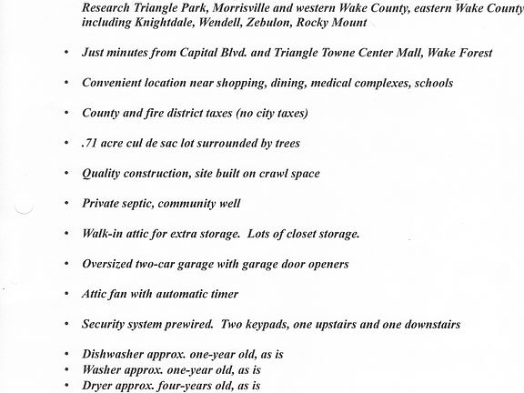 Wonderful quality-built home on .71 cul de sac wooded lot! Great private neighborhood near 540. 3 bedroom plus bonus room w/ closets plus third-floor rec room. Sunroom/den off family room. Freshly painted walls and trim most rooms. Amazing walk-in closets and storage! Beautiful street, no city taxes. Includes refrig, washer, dryer, prewired security system w/ two keypads. One year warranty. Quality const. by local builder. Gas line on street. Sold as is, no known problems. Needs new carpet.