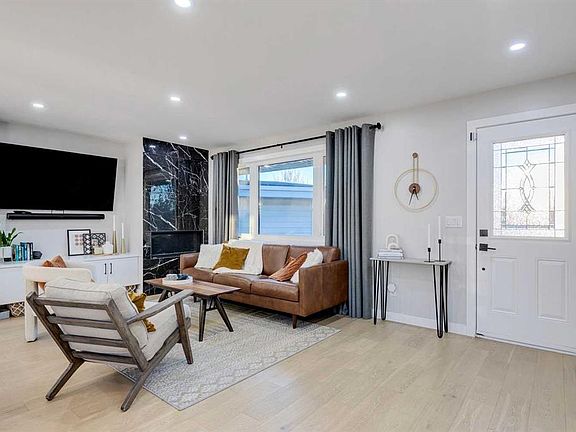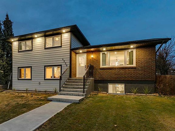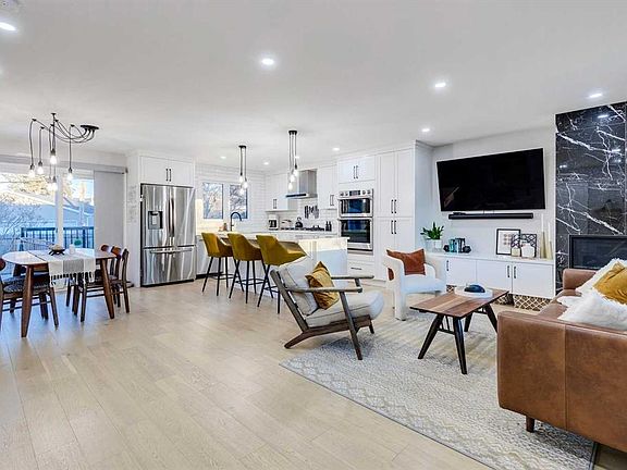 LUXURY RENOVATION | 5 BEDS + 3 BATHS | 4-LEVEL SPLIT | 2,600+ SQ FT OF LIVING SPACE | DOUBLE GARAGE | FACES GREEN SPACE This completely redesigned and modernized home offers a perfect blend of functionality, style, and luxury in the highly desirable community of Varsity. Ideally located just minutes from the University of Calgary, Market Mall, University District, and the LRT, it provides exceptional convenience for both families and professionals. Rebuilt from the studs up in 2022 the renovation met 2022 building codes with new plumbing, electrical, insulation, heating, and exterior were installed ensuring quality and longevity for years to come. Inside, the main floor showcases an open-concept layout with engineered hardwood throughout and large windows that flood the space with natural light. The contemporary kitchen is a chef’s dream, featuring custom shaker cabinetry, a generous pantry, subway tile backsplash, and a premium stainless steel appliance package that includes a French door refrigerator, gas cooktop, built-in oven and microwave. A spacious quartz-topped island provides extra prep space, breakfast bar seating, and a stylish focal point for gatherings. The inviting living area centers around an elegant inset gas fireplace with a dark tile surround and built-in media unit, creating the perfect place to relax. The adjacent dining area opens through large sliding doors to a large deck and interlocking brick patio—an ideal setting for outdoor dining and entertaining. Upstairs, you’ll find continued hardwood flooring and a stunning primary suite designed for comfort and sophistication. The room features a soft grey accent wall, large window, custom walk-in closet, and a beautiful barn door that leads to the luxurious spa inspired 5-piece ensuite. The ensuite includes a modern double-sink vanity, freestanding soaker tub, and a glass-enclosed shower with. A secondary bedroom overlooks the front yard and green space across the street, while a nearby 4-piece bathroom offers matching quartz counters with a tiled tub & shower combo. The lower level adds even more functional living space with engineered hardwood, three additional bedrooms, a full bathroom, and a stylish mudroom featuring built-in storage and direct backyard access. One level down, a bright and expansive rec room awaits—complete with plush carpeting, a custom media wall, and a wet bar with built-in cabinetry and a beverage fridge perfect for watching the game or movie nights with the family. Outside, the private backyard is fully fenced and opens directly onto Varsity Acres Park—perfect for kids, pets, and outdoor activities. With its prime location, modern updates, and timeless design, this exceptional Varsity home offers the perfect balance of luxury, comfort, and convenience.