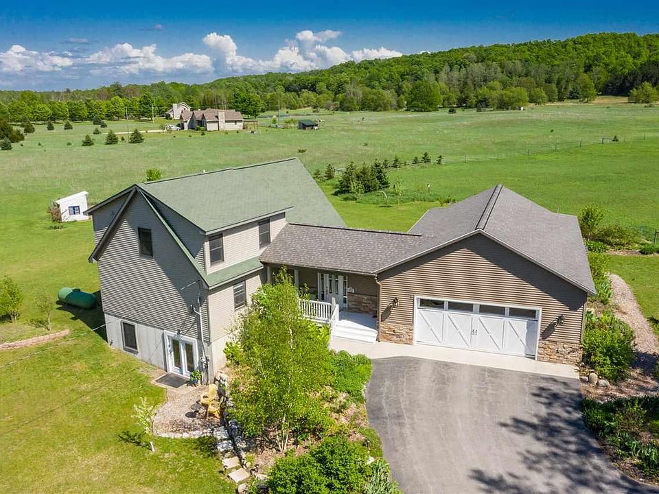 Charm and Style abound on this 5 acre country estate. Enjoy the colorful landscaping and breath taking country views. This magnificent home features 5 bedrooms, 3 baths, with huge windows expanding up to cathedral ceilings. New garage, driveway, front porch and breezeway addition takes you into this airy open floor plan with beautiful tile and a Mount Vernon pellet stove (the mack daddy of all pellet stoves). The kitchen offers new cabinets by Shenandoah, granite counter tops, tile backsplash, and stainless steel appliances. Be the first to entertain your friends and family in this gorgeous (never used) kitchen! Large master suite on your own floor with a jacuzzi tub, private shower and a 9x7 walk-in closet that is on everyone's wish list. Finished walk-out basement with you own private mini kitchen, two bedrooms, full bathroom and a nice family room for entertaining all your friends. This lower level has endless possibilities. Use it as a mother in-law suite, rent it out year round with its own private entrance. Large corner lot, with the most lavishing landscape you have ever seen. Enjoy a cup of coffee on your back deck looking over your 3 1/2 acres of fenced in pasture and enjoy the tranquility of your private setting. Completely set up for a fabulous Horse property, featuring two pastures with 5 year old lean, cross fenced, water trough access and frost free water spigots installed in the pasture. Complete with saddle room and workshop space. Get lost in the magnificent 80' x 40' garden with grapes, berry bushes and ready for planting whatever your heart desires. There are also 18 planted fruit trees around the property. This home is a must see to appreciate everything it has to offer. Enjoy paying cheaper taxes and only 12 minutes to downtown Traverse City.