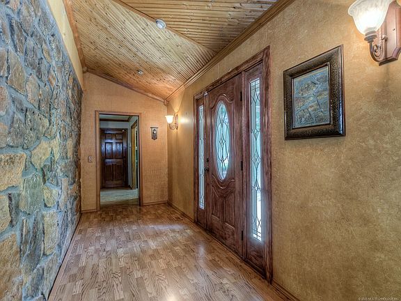 Private & secluded park-like setting on 1.25 acres in Jenks Schools. Home features rustic elegance w/ native stone + custom designs including sunken living area, soaring ceiling & towering wood burning fireplace. Master enSuite + 2 bedrooms & either a second living area or a game room. Backyard includes 36'x20' pool 8 1/2' depth & the serenity of a forest. 200' zip line. Designer remodeled hall bath, new driveway, newer HVAC, 2018 roof, some retaining walls replaced. Previous pier work. Sold as is.
