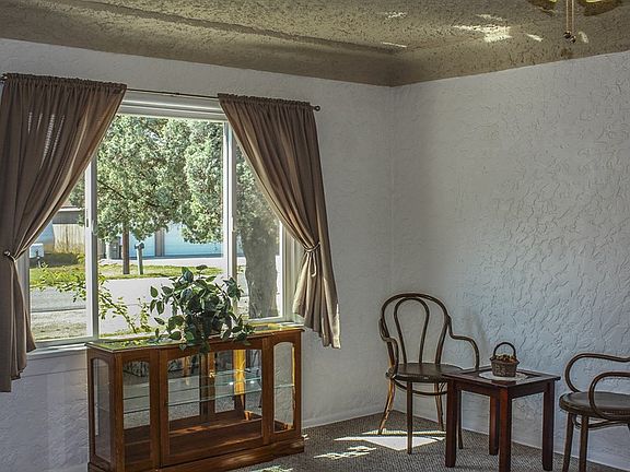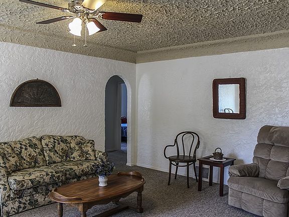 A little Retro, A little Vintage and A little Southwestern! 3 bedrooms,1 bath. 1194 sqft. A little charmer for you to add your personal touches! Coved ceiling with textured walls. Arched entry ways. Vintage kitchen has wood cabinets,12' hardwood floor tiles. Appliances are included. New vinyl windows and New exterior door. Newly painted interior and exterior.Newer carpet with heavy thick padding. The bedrooms are spacious each with a closet. The bathroom is retro in design and color and has new sink, toilet and drain lines. Large backyard with trees. Small storage shed.Oil forced air furnace. Metal roof and 1 car carport. Basement is unfinished. Great Location