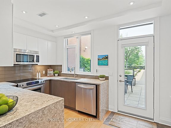 Experience over 1,700 sq. ft. of contemporary living in this exquisite end-unit Brownstone nestled within the serene enclave of Ravenhill Commons. Winner of a first-place Annual Design Award in 2015 and crafted by architect Barry Hobin, this home is a standout gem in the heart of Westboro. Surrounded by designer boutiques, artisanal coffee shops, acclaimed restaurants, and art galleries, the location offers unmatched walkability and lifestyle. The main floor presents an open-concept layout, featuring a stylish living and dining area warmed by a sleek gas fireplace, framed by oversized windows, and finished with rich hardwood flooring. The gourmet kitchen impresses with quartz countertops, stainless steel appliances, and soft-close cabinetry. Step through to a private, low-maintenance patio - set against manicured communal greenspace in this impeccably managed community. Upstairs, a sun-filled family room with custom built-ins, hardwood floors, and a private balcony offers a cozy yet refined space to unwind or entertain. This level also includes a generous secondary bedroom and an adjacent 4-piece bath featuring tile, a quartz vanity, and stylish finishes. The top level is a dedicated primary suite sanctuary. A spacious bedroom opens to a sunlit terrace, complemented by a massive walk-in closet and a spa-inspired ensuite with a glass walk-in shower, double vanity, and timeless design elements. The lower level includes a large den ideal for a home office or gym, a convenient 2-piece bath, and two private storage rooms with direct access to the secure underground garage. With transit access on Churchill Avenue and proximity to future LRT stations along Scott Street, commuting is effortless. Enjoy weekend strolls to Westboro Beach or bike rides along the Ottawa River Pathway, all just minutes from your door. This property offers a true maintenance-free lifestyle, with the monthly fee conveniently covering all common area maintenance and the heated underground garage.