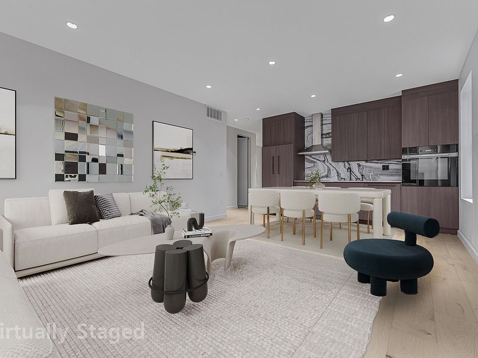 Step through the elegant entry foyer, a welcoming introduction to this thoughtfully designed residence, guiding you into the breathtaking open-concept living roomthe heart of the home. With soaring 10-foot ceilings and oversized windows flooding the space with natural light, this expansive living area creates an airy, inviting ambiance. Adorned with 10-inch wide white oak floors and bespoke architectural details, it's the perfect setting for both intimate gatherings and grand entertaining, offering a versatile canvas for your lifestyle.