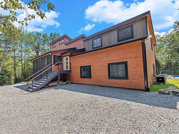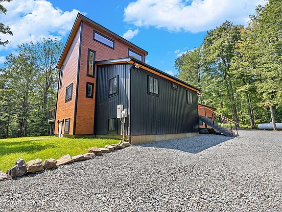 BACK UP OFFERS ONLY UNDER CONTRACT Welcome to your own private Scandinavian oasis in the heart of the Pocono mountains. House features new roof, siding, pool, water heaters, furnace, ACs (5 zones), hardwood flooring, quartz countertop, sauna, hot tub, deck, electrical, plumbing, kitchen, doors and windows - all installed in 2023. The home is nestled in a VERY secluded and unique setting, offering privacy and tranquility. With its modern Scandinavian design, this home is truly one-of-a-kind. This stunning modern home comes fully furnished and boasts a spacious and open floor plan, with 6 bedrooms and 4.5 bathrooms. This property is a busy and very successful short-term rental, making it an excellent investment opportunity.