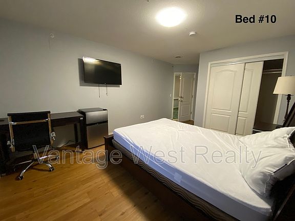 This home has a giant shared kitchen with double ovens and gas range, dining room for seating for 10 and giant living room with 80 inch TV.