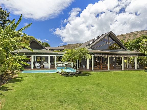 Gated access and a long roundabout driveway lead to the grounds of Maunalua Sunset estate, where the central courtyard, meandering resort-style swimming pool, and jacuzzi create a focal point for guest gatherings. Along with covered patios and walkways winding among the structures, this peaceful retreat offers an oceanfront yard with places to lounge in sun or shade.