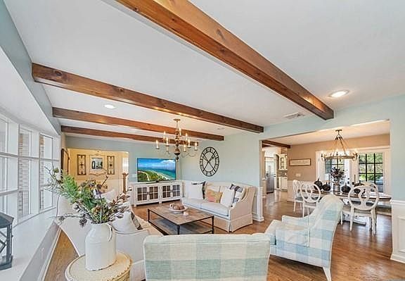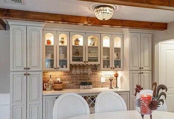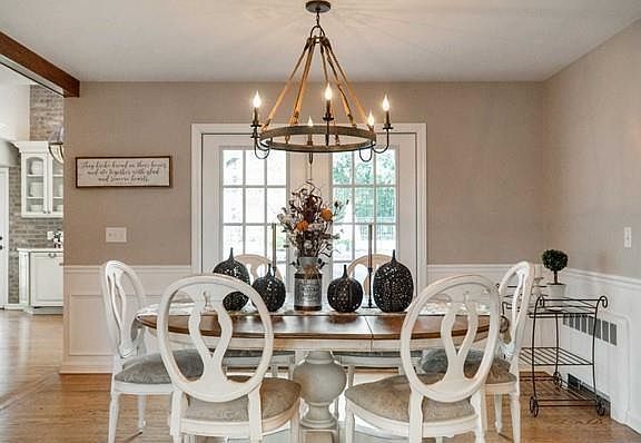 French Country meets modern farmhouse elegance in this beautifully single-family residence. Offering 4 Beds / 3 Bath, this home blends character with today's comforts throughout. The inviting living room showcases exposed wood beams, a statement fireplace, and custom built-in bookshelves, creating the perfect space to relax or entertain. The formal dining room features French doors that open to the rear deck and expansive, manicured yard, seamlessly connecting indoor and outdoor living. The chef's kitchen is a highlight, featuring abundant cabinetry, quartz countertops, stainless steel appliances, a farmhouse sink, and generous workspace for everyday living and hosting. First-floor primary suite complete with a sitting area, walk-in closet, and a beautifully updated en-suite bath. An additional bedroom and full bathroom complete the main level. The second levels offers additional 2 bedrooms up the stairs on seperate sides of the house. Enjoy year-round light in the three-season sunroom, which opens to a stunning outdoor retreat with lush landscaping and serene surroundings., while the finished basement with a full bath, kitchen area, and large family room provides ideal accommodations for guests, work-from-home, or extended living. Step outside to your private oasis featuring a heated Gunite pool, full paver patio, and gas fire pit, perfect for entertaining or unwinding. The property also includes a two-car garage and driveway parking for multiple vehicles. Don't Miss out!