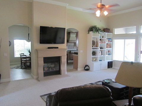 Lovely single story Clovis home. This home features a large great room with high ceilings, surround sound and a double sided fireplace to the eating area that adjoins the beautifully appointed kitchen. The kitchen includes a breakfast bar, granite counter tops, GE stainless appliances including 6 burner gas stove top, wine cooler, plenty of cabinets and a utility sink. The owner's suite features double closets with built-ins, double sinks, soaking tub and separate shower in the bathroom. The nicely landscaped yard includes extra concrete extended from the covered patio as well as gas connection for barbeque. Fantastic built in storage cabinets in the garage.