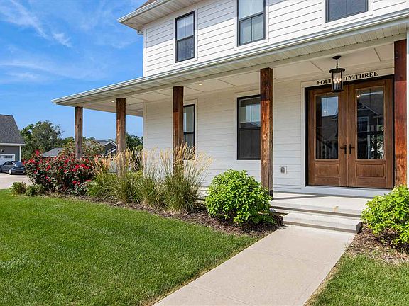 Move in ready! Featuring a timeless blend of traditional home + a farmhouse style exterior with a three car garage. Complete with a wrap around porch ready for relaxing and watching the sunrise. Highlights include 10+ ft ceilings, herringbone marble fireplace, open concept kitchen, expansive hallways, ample room for gathering and the perfect eastside Iowa City location. You must see the layout, bonus rooms and storage in this home. The generous primary suite boasts vaulted ceilings an ensuite bath and soaking tub + floor to ceiling walk-in tiled shower and double vanity. 2nd floor laundry is the ultimate convenience. The upper level offers a flex space for favorite hobby or to be used as a den. 3 zone hvac offers comfort throughout the home.