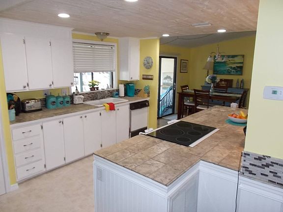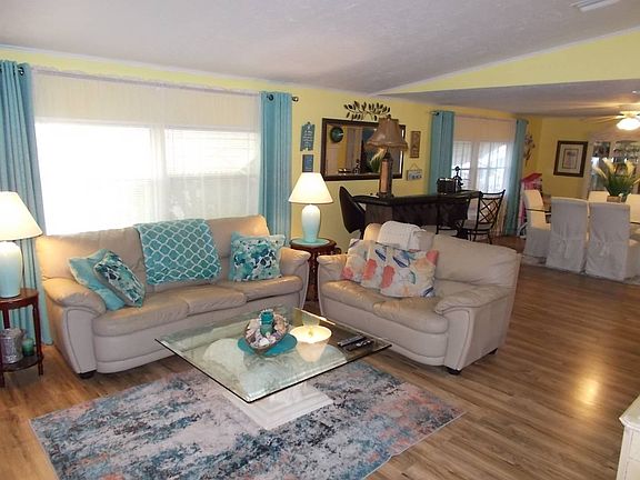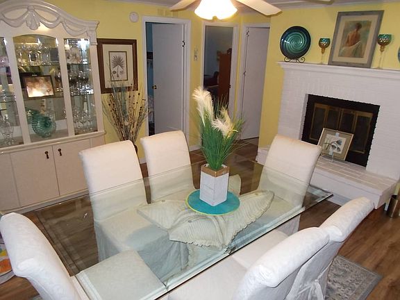 This is an open floor plan with split bedrooms. Walk in to an open living, dining and kitchen area perfect for entertaining. You can be in the kitchen and still be part of the party. Not to mention the wood burning fire place in the formal dining area. Large kitchen island for lots of counter space overlooking the living room. Newer flush mounted cook top/stove, tiled counter tops and lots of cabinet space. Two bedrooms and second bath is one end of the home, giving your guest easy access To the bath and privacy. At the other end is the large master with en-suite with step in shower and garden tub for relaxing after a long day on the golf course!! Sliders that lead to the screened lanai and access to the carport.