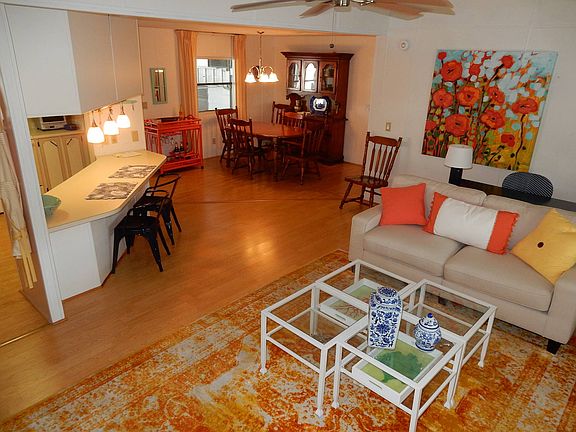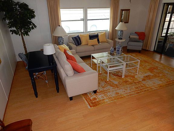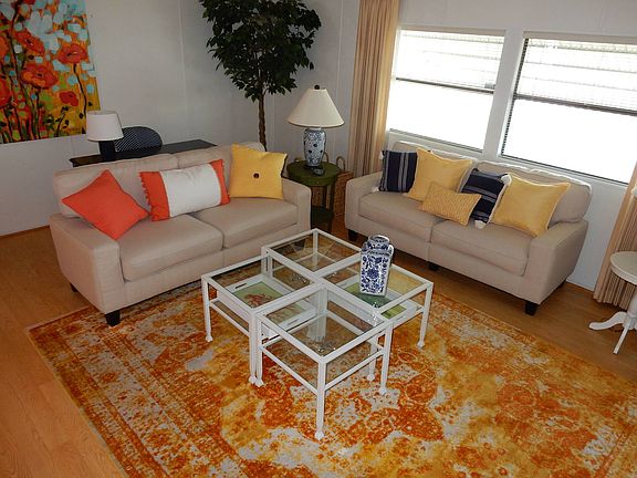 Very nice 1985 fully furnished Coronado 26' X 44' doublewide on desirable corner lot in 55+ pet friendly community. This home has beautiful laminate floors throughout, tile in both bathrooms. Kitchen is open to dining and living areas and boasts island breakfast area. Master bath has en-suite with step in shower and slider doors. Large sink area is off master bedroom. 2nd bath has tub/shower combo. Large lanai is carpeted and has A/C for more living space. Windows have awnings for extra shade. Water heater is an on-demand model and was replaced in 2021. House was just tented April 2022 and warrantee is transferable. Come tour this home today before it's gone!