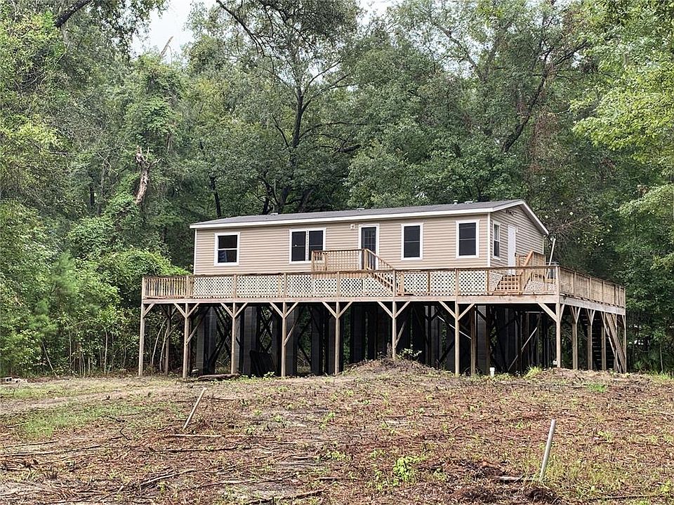Florida Country Living! Only blocks to the Suwannee River. Built in 2010 this elevated, manufactured stilt home design with concrete block foundation, has 3 bedrooms 2 baths and is situated on over a ½ acre (3 lots). Complete with a huge wrap-around deck perfect for entertaining and surrounded by nature. Come enjoy your freedom, no HOA or deed restrictions, you own the land. Features include a Large living room, large eat-in kitchen, an island/breakfast bar plus a pantry, central heat & air, ceiling fans w/lights in every room, oversized primary bathroom, walk-in closet, and tons of parking. This is the perfect retirement home or weekend retreat. Grab your boat, canoe, or kayak, and come relax with the river life. Home priced for a quick sale.