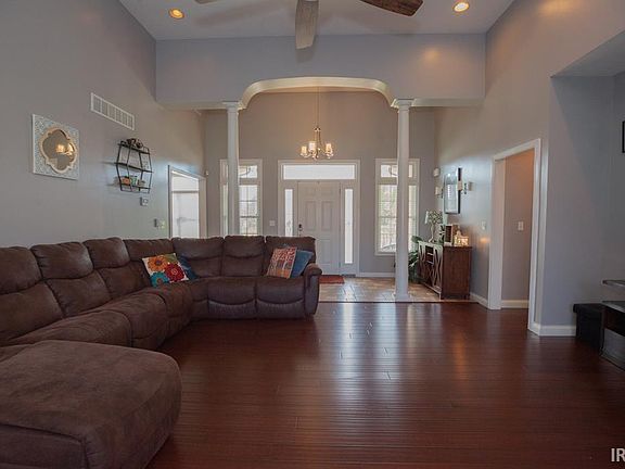 Do not let this home deceive you in its size! This large 4 bedroom, 3.5 baths + a bonus room home sits in a wonderful subdivision on the north side of Evansville. With over 3200 sq. ft, this home has so much to offer. Your are greeted with wonderful curb appeal and a massive side-load 3 car garage! As you enter the foyer of this home there are soaring ceilings and beautiful hardwood floors. There is a formal dining room adjacent to the kitchen. Here in the kitchen you will find upgraded appliances and an eat-in dining space as well as island seating. There is a convenient room tucked next to the kitchen that is currently being used as an office space, but would also make a great playroom or guest area. A large mudroom separates the kitchen from the garage and connects the laundry room that has plenty of folding and hanging space. The washer and dryer are included! This home has a main level master with tall ceilings with lots of natural light, his and hers walk-in closets and a generous en-suite bathroom. There is even a 8x7 nook in the master making it feel even bigger and provides opportunity for a sitting area. 2 additional bedrooms are on the main level and share a guest bathroom. Upstairs there is a split design that boasts a full bath, a bedroom with a large walk-in closet and access to attic storage and on the other side is a 37 foot bonus room! This home has so many flex spaces and plenty of room to spread out. The back yard is fully fenced and has a wonderful covered patio area as well as additional open patio space. There is a large yard barn if you need more storage, but be sure to check out all the additional built-in storage in the massive garage. There is a small claims home warranty being included with the sale for buyers peace of mind.