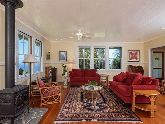 Experience the feeling of entering your own private world with expansive ocean views. Banyan trees & rock walls welcome you to a secluded, well kept 1940's plantation manager's home. Enjoy the timeless original hardwood floors, five panel doors, redwood walls, built in cabinets/shelves, high ceilings, & tropical breezes flowing through the double hung windows. This naturally well lit home encompasses approx. 2,052 sqft under roof including 3 bedrooms, theater room, full guest bath w/ clawfoot tub & custom shower, tiled ¾ master bath, & a bonus room at the back of the house facing tropical landscaping. Home has optimal layout for entertaining, ample closets and storage, plus large kitchen with walk-in pantry. Below the main level is a garage/workshop, & ½ bath in the basement/mud-room. The current owners have done improvements and installed period fixtures to keep the home's charm, plus a lovely Jotul gas stove to help warm you on cool winter mornings. The land area is just over 1.1 acre & a permanent easement gives a total of approx. 1.5 acres. The home comes w/ a fully owned 5.3 KW solar system w/ net metering & 25year warranty (installed 2014), new hybrid water heater, and a central vacuum system. This is arguably the most ideal elevation (600-700ft) along the Hamakua Coast, sunny but cooled by trade winds. Plants thrive at this elevation and already established are macadamia, avocado, coconut, mango, banana, tangerine, lime, calamondin, ferns, orchids, & more. Located at the end of a dead end road with only four homes, surrounded by large acreage, & just a minute drive below Historic Honokaa w/ restaurants, galleries, shopping, theater, medical clinic, & a short distance to Waipio Valley. Approx. 20 minute drive to Waimea w/ world class restaurants, hospital, & highly regarded private schools. Come see why we feel, "Lucky to live Hamakua".