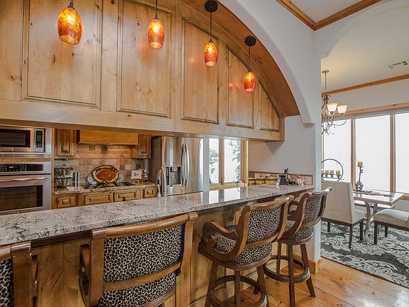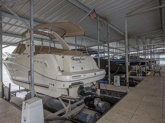 Beautiful panoramic waterfront views without waterfront price! Mediterranean Ranch walk out 10 foot ceilings Central vac system wide wood plank floors travertine tile floor in master Granite throughout 2 upper composite decks facing light and one large covert concrete patio below Oversize garage fits two vehicles and golf cart Boat slip Community pool lawn maintenance gated community