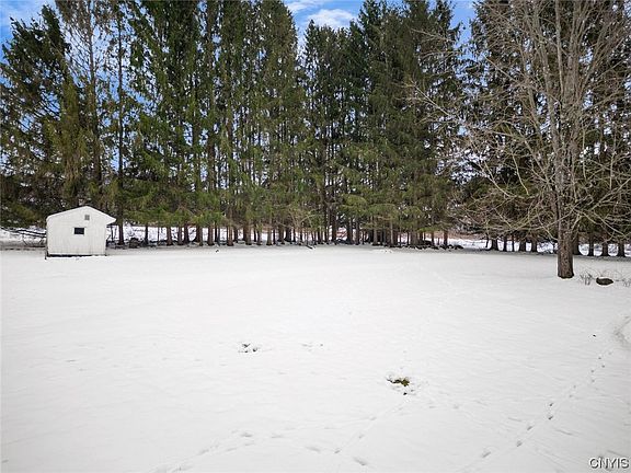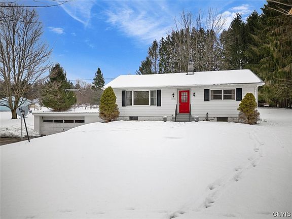 Ranch home with sunset views facing Lake Moraine! Beautiful open lot that is partially tree-lined. 2 bedrooms and 1 bath with an eat in kitchen and a living room with picture window. Front entry with coat closet. Laundry hook ups in basement with work bench space! Corner lot not far from the village of Hamilton and close to the Hamilton Inn! Attached garage with metal roof. Back shed for extra storage. Newer roof in 2019. Sunrise through window over kitchen sink.