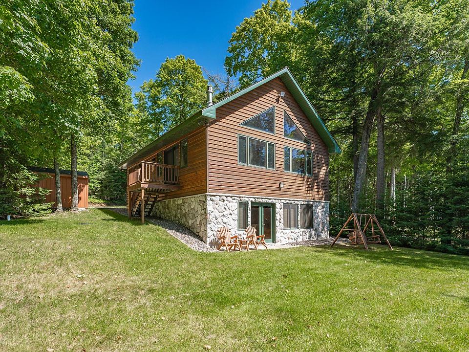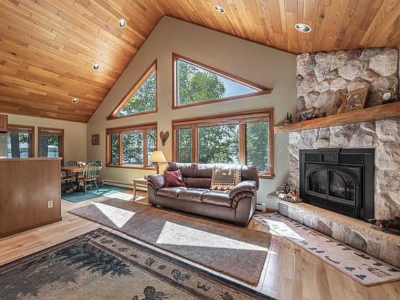 North Twin Lake -2788 ac lake that connects to South Twin Lake for a total of 3400+ ac of Northwoods lake fun. 3 BD, 2 BA chalet on 104’ of perfectly level sand frontage. The cedar sided home sits about 45’ from water’s edge & provides an open concept with a wall of windows giving you expansive & BIG water views of North Twin Lake, a lake well known for trophy Muskie's & countless hours of boating fun. The ash cathedral ceilings, fieldstone gas F/P w/ cherry mantel & maple hardwood floors creates a cozy atmosphere while also giving you easy access to the kitchen that has stainless steel appliances. Finished lower level walkout has a large family room w/ tile flooring, bar, in-floor heat, full bathroom w/ walk-in shower, bedroom & utility area where there are washer/dryer hook-ups & the extensively design boiler system. Walkout to the lush green lawn w/ fire pit area where memories begin or to the level sand frontage & enjoy a day at the lake. Your Northwoods gem, don't miss out!