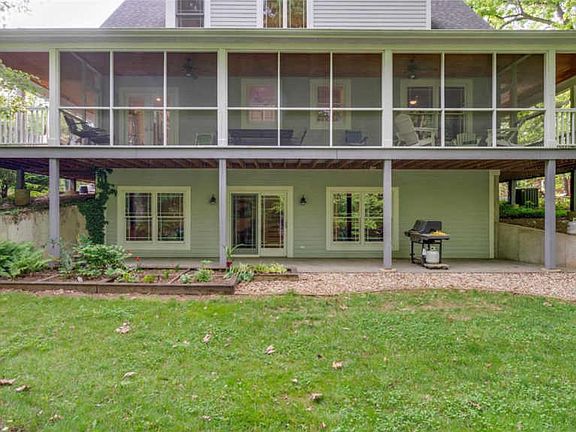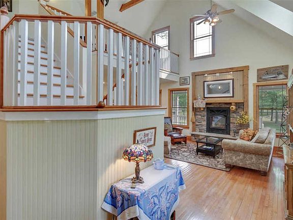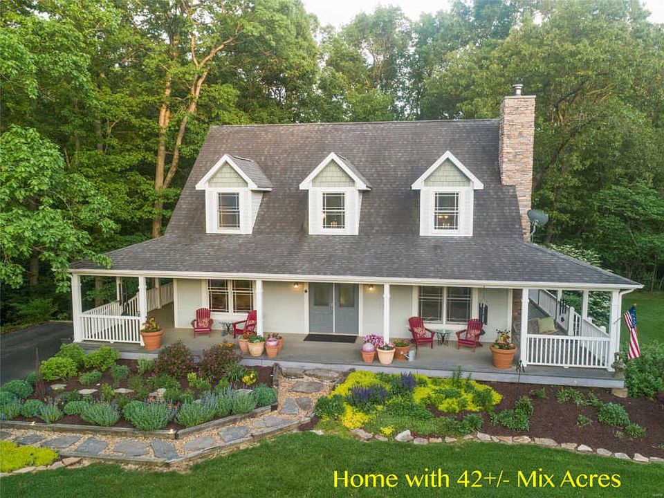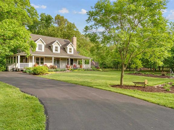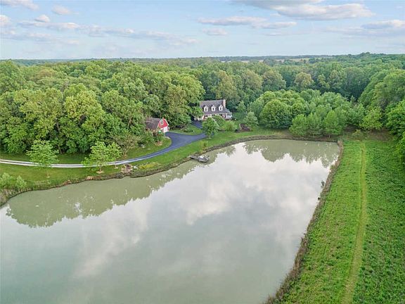 Home with wrap around porch on 42 acres is set back off the road on a tree lined driveway and overlooks the lake. The home has a great room opening to the living room and fireplace, dinning room and kitchen, one bedroom on the main level currently used as an office, a bathroom and a den (TV room). Upstairs is a Master suite and loft used as an office nook. The basement is finished with a family room, wet bar and bathroom, and walks out onto a stamped concrete patio. There is plenty of storage in the unfinished area. The two car detached garage offers an apartment upstairs that includes a 3/4 bath, kitchenette and sleeping area. Beautiful inside and out, this home features Hardy board siding, craftsmen style windows, wood beams, wood floor and quartz counter top. The woods are in the Wildlife Habitat Incentive Program and the underbrush has been kept away. Horse Creek, a rock bottom creek, runs on the back of this property. 42 acres includes woods and 9+- acres of tillable ground.