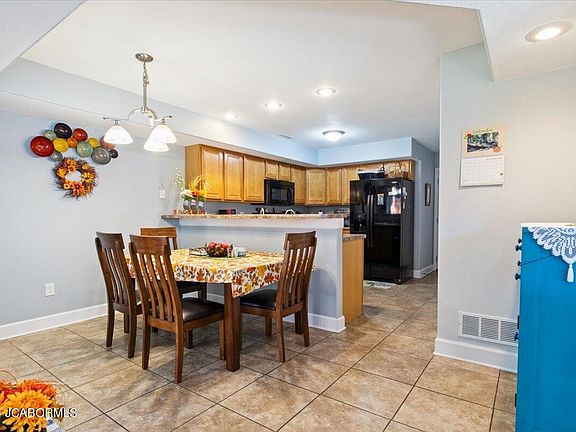 The kitchen has custom maple cabinets with an island that opens into the eating area