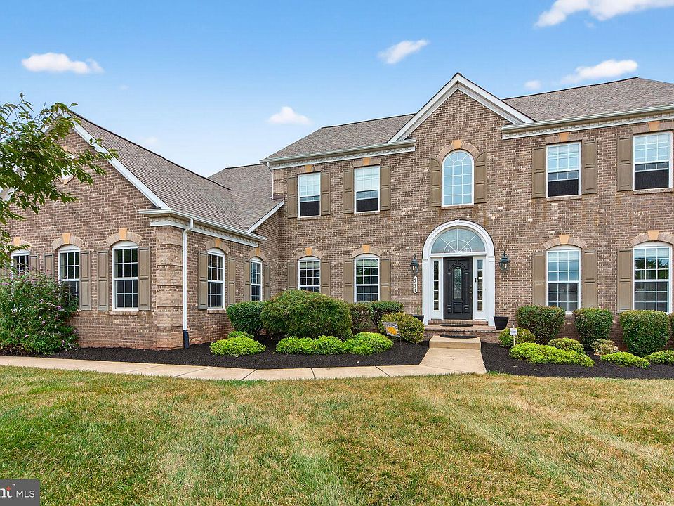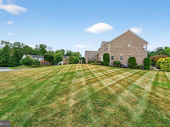 Grand, majestic, colonial with brick on three sides. Knightsbridge model built by NV Homes. Two-story foyer features Palladian windows, premium select French pattern noche tumbled travertine pavers flooring, and oak curved staircase. Living room boasts hardwood flooring, crown molding, 1/4 round shoe molding, and recessed lighting. Large formal dining room with tray ceiling, hardwood flooring, and wainscoting. Family room with gas fireplace, Palladian window with view of trees. Main-level office with wood and glass French doors, crown molding, recessed lighting, and floor to ceiling custom built-in stained wood book shelving with cabinet. Main level half-bath/powder room. Gourmet kitchen with hardwood flooring, 6-burner gas stove with oven, wall oven, built-in microwave, kitchen island, breakfast bar, granite countertops, top-of-the-line stainless Viking appliances. Both ovens are convection or standard usage. Eat-in breakfast area. Pantry. Sunroom with octagonal ceiling and hardwood flooring. Primary bedroom suite with tray ceiling and sitting area, two walk-in closets, luxury primary bath with tray ceiling, Jacuzzi, and walk-in double shower with seating. Jack & Jill full bath serves two additional bedrooms, and private full bath serves fourth bedroom. Lower level (basement) is fully finished except for a small part of the utility room. Lower level also features a large theater and exercise room, as well as a kitchen with sink, dishwasher, refrigerator and cabinet. Lower level also features a den which can be easily converted to a 5th bedroom by adding a closet. The den has a full Jack & Jill bathroom to serve the lower level. Parking driveway space outside the 3-car garage is utterly massive as is the multi-level patio with fire pit.