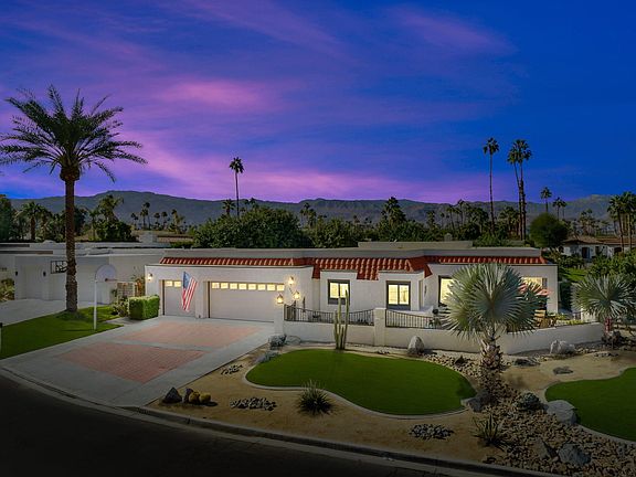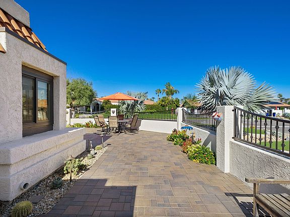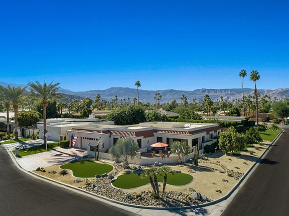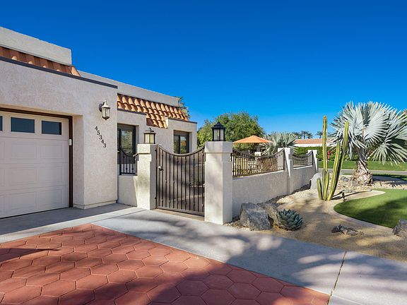 A Mediterranean-style charmer in sought-after Indian Wells. This 3 bedroom, 3 bath home is sited on view corner lot on a quiet cul-de-sac. An expansive patio with beautiful views of the mountains to the south welcomes you. The double door entry leads you to the open concept living space that flows to the beautifully designed kitchen, informal dining and out to the pool and private backyard. The custom kitchen was completed in 2018 and features a fantastic island with ample space for guests and cook. Nice views to the front patio and plenty of light make this the perfect space anytime of day. The informal dining and living room offer plenty of options for entertaining or relaxing. Off the living room you'll find a roomy office and bathroom. Two guest bedrooms, one is ensuite, are down the hall. The master suite is large and abounds with natural light.The master bath has a separate tub and shower as well as a double sink vanity. With direct access to the pool and spa it's a great place to unwind. The pool and patio area are private with south and west exposure. Your own fruit orchard is on the west side of the yard with an abundance of citrus and fruits. Wonderful indoor/outdoor living. Located in non-gated Indian Wells with no HOA, close to golf, tennis, hiking, bike riding and all amenities. Make this updated and comfortable home yours.