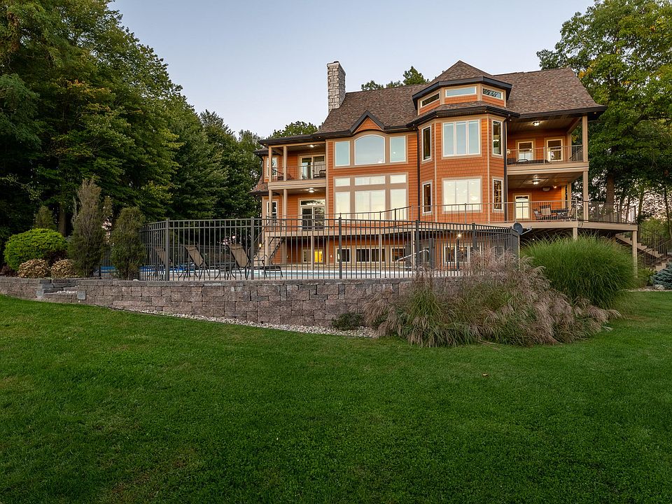 A spectacular custom built home on 525 ft of Lake of the Woods frontage, an all sports lake leaves nothing to be desired. With plenty of large windows and natural light, the breathtaking sunset views are year round. This 4 bedroom, 5 and a half bath house has a mile long list of upgrades which have been attached to this listing. The high end finishes, modern paint and Brazilian cherry hardwoods keep this home a luxury getaway or a year round retreat. The professional design and color selection is stunning. The chefs kitchen provides plenty of workspace, cabinets, snack bar and a walk-in pantry which making entertaining a breeze. Upstairs features two suites and a third bonus room which could be used for a multitude of uses. The walkout level offers a completely separate living space for guests, if desired. A heated oversized attached garage provides plenty of space for a workshop and the additional barn provides the perfect place for boat and other storage space.