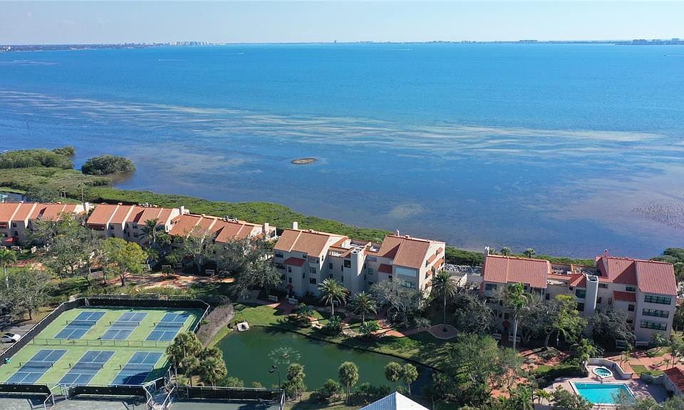 Enjoy front-row sunset views from this top-floor former builder’s model, with sweeping panoramas of Sarasota Bay and the downtown Sarasota skyline. This single-level residence (no stairs) offers a private elevator that rises from your private two-car garage into your waterfront haven. Enjoy peace of mind with a newly installed tile roof, impact windows, a completed Milestone structural-integrity inspection, and well-funded association reserves (per reserve study). Soaring vaulted ceilings with tongue-and-groove finishes, plantation shutters, and a wood-burning fireplace make the Great Room the heart of this 2,100 sq ft coastal retreat, where natural light and breathtaking bayfront views take center stage. This peninsula-like vantage point ensures extraordinary, uninterrupted views — golden sunsets can be enjoyed from the enclosed patio, the formal dining room, and even while standing at the kitchen sink. The enclosed patio offers amazing flexibility: 350+ sq ft with sliders open for a fresh bay breeze or closed with the dedicated AC split system for comfortable water views in all seasons. You simply must see the downtown Sarasota skyline and Ringling Bridge lit up at night. An updated kitchen with a tasteful coastal ambiance features a custom Italian glass backsplash and premium Bosch dual wall ovens. Tucked away from the entertaining space, the primary suite offers its own water views and a spacious ensuite. The versatile guest bedroom includes a custom Murphy bed built-in — perfect for visiting guests or easily converted back into a quiet home office. For added convenience, the owner refreshed the carpet in both bedrooms, ensuring they are comfortably move-in ready. Various interior storage closets, along with a full-size washer and dryer, provide the comforts of a single-family home. Tucked quietly away from busy downtown or barrier island traffic, you’ll enjoy a natural waterfront experience while being just a 20-minute drive to downtown Sarasota or Anna Maria Island. Conquistador Bay Club is a boutique development with only 28 units spread across five buildings, where residents enjoy a community pool and spa along with private kayak access to the bay. The elevated block construction stood strong through the active 2024 storm season, offering lasting peace of mind for years to come. IMG Golf, waterfront dining, and fitness center are all just a chip shot away, with optional social and fitness membership access for only $600/year. A short drive to SRQ Airport, this residence offers the perfect balance of seclusion and accessibility. Easy to show — reach out to see the remarkable waterfront views in person!