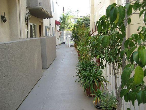 Available now. Rear, quiet second-floor apartment with green view in 8-unit building overlooking residential area. Apartment has been completely renovated and upgraded, including new washer & dryer in unit. Real cherry hardwood floors (laid by hand). Gas fireplace in living room. Balcony with sliding glass door and view. Kitchen includes stove, dishwasher, microwave, refrigerator, and disposal. Tiled countertops, oak cabinetry, and ceramic tiled flooring. Recessed lighting in kitchen and hall. Both bathrooms tiled and upgraded. Central air conditioning and heating. Gated garage with 2 tandem parking spaces. Controlled access building. Keyless front and rear entry. Neighborhood park one block away. Walking distance to Gelson's and other boutiques. Easy access to all freeways (101, 134, 405). Close to studios; just over the hill to Beverly Hills, Hollywood, and West L.A. Approximately 900 square feet. Pets welcome with deposit. One-year lease.