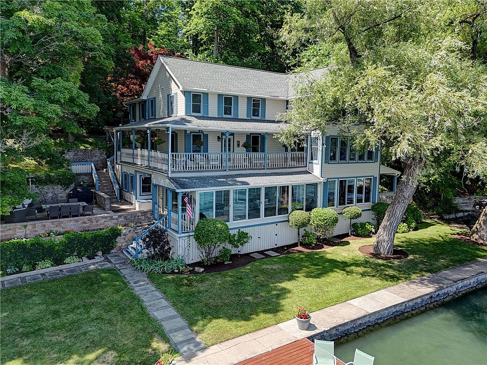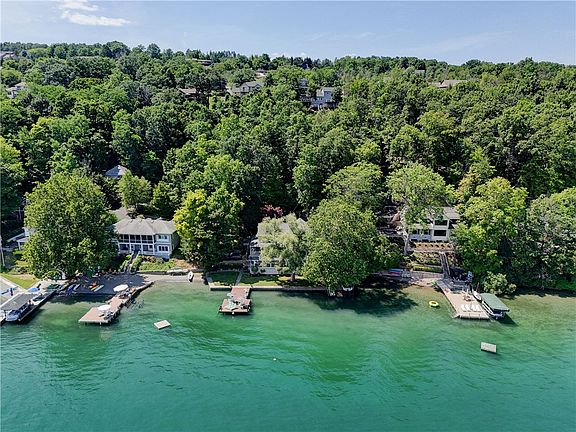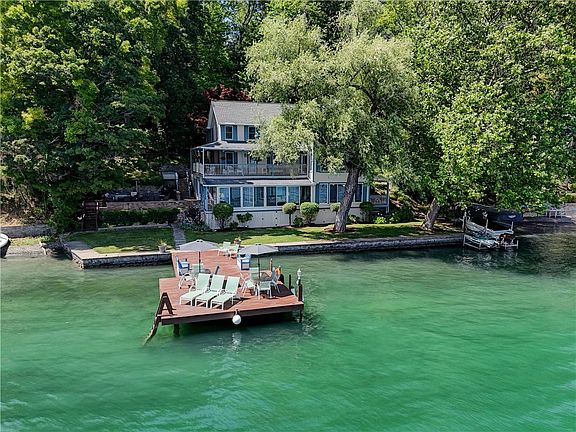 DON'T MISS THIS RARE OPPORTUNITY ON CANANDAIGUA LAKE!! This amazing offering features 140 feet of flat lake frontage with amazing waterfront views. This secluded 8 bedroom home off West Lake Rd. is located on private Davidsons Landing. This 4900 sq ft home has it all - with three full floors of living space. The first floor Great Room includes a wall of built-in bookshelves, a gas fireplace, and access to a large sunny enclosed porch. Beautiful woodwork encompasses two large eating areas, and a bright light-filled kitchen that has a large breakfast bar that has been updated with new SS appliances. On the second floor there is an oversized primary with a wall of windows framing exquisite lake views. A large walk-in closet, bathroom with shower, Jacuzzi tub, and a double vanity completes this spacious room. There is also a door that allows direct access to the open porch. The same floor has an additional bedroom, a full bath, as well as a convenient laundry room and adjacent utility room with loads of storage. The third floor has six bedrooms and two full baths with easy access to the outside. The exterior features an expansive stone patio off the kitchen for entertaining - as well as an open covered porch, large permanent dock, and boat hoist. This convenient location is only 4 miles from all the town of Canandaigua has to offer, including restaurants, shopping, marinas, and Wegmans! The property is serviced by public utilities for gas, water, sewer and high speed internet. Additional updates include; new driveway (2024) with large parking area, third floor carpeting (2020), two air conditioning units (2019), roof (2015), flooring (2018). Only permits on file with the town will be provided. Annual HOA approximately 2-3K per year. Please do not drive down the road without an appointment. Please allow 24 hours to respond to offers.